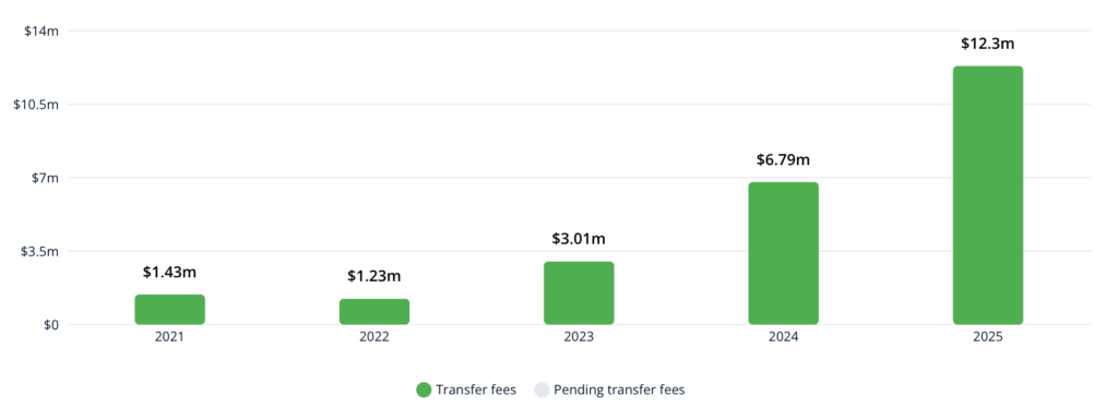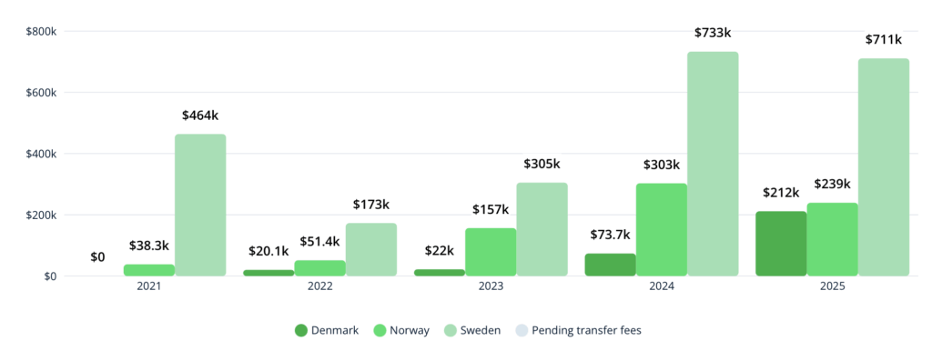 FIFA opdatere løbende databasen med transferaktiviter, hvor du kan gå ind og se udvikling globalt og pinde ned på regioner og lande. Nu er sommervinduet lukket ned og tallene gjort op, og det er tydeligt at se, hvordan kvindefodbolden vokser og hvilke lande, der er lokomotiver i udviklingen. Jeg stiller skarpt på et par af tendenserne. Du kan selv grave dybere her: Kilde: Fifa https://inside.fifa.com/transfer-system/transfer-reports?utm_source=chatgpt.com&tab=Women%27s+mid-year+transfer+snapshot+2025